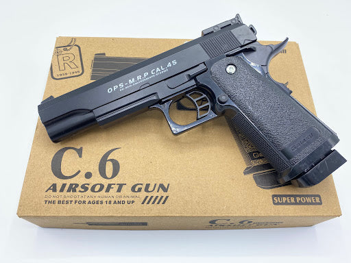 The C.6 6mm Airsoft Pistol is a compact, spring-loaded BB pistol ideal for beginners, hobby shooters, or collectors. Its simple manual operation and lightweight frame make it perfect for casual target practice or as a backup replica. Constructed from durable polymer with a mock tactical design, it offers an affordable yet fun shooting experience.