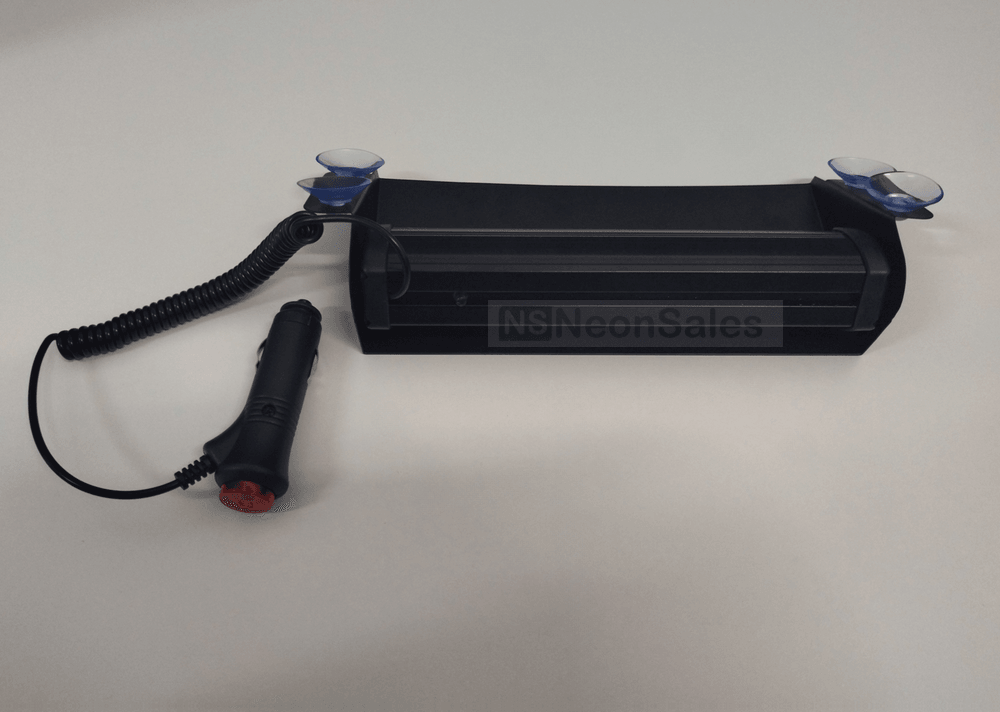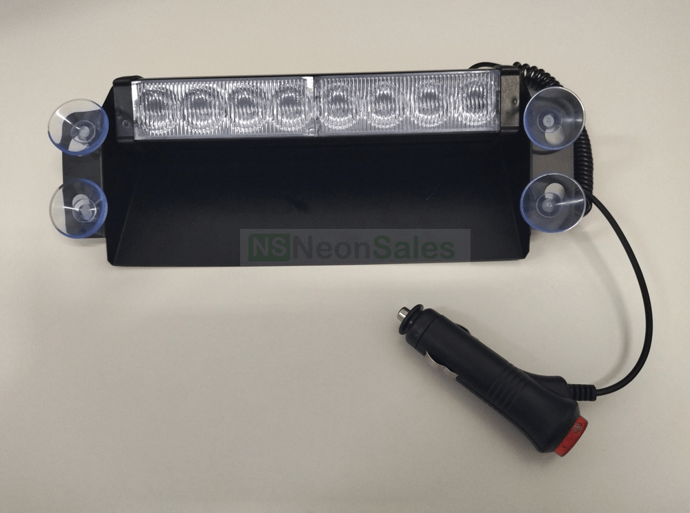 Dashboard mounted LED flashlight strip, consisting of 8 LEDs, all of which are bright white. The entire module is plastic and comes w/ an integrated 12V cigar lighter port adapter. The rear of this adapter, has a push-switch which toggles the power on this unit.