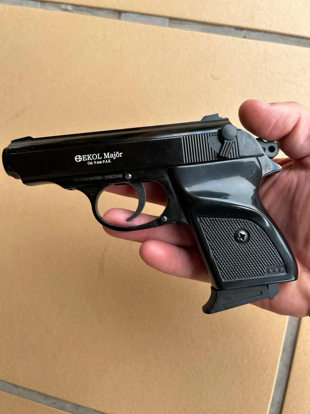 This is the EKOL MAJOR, a lovely, if not excellent, replica of the WALTHER PPK pistol. As with all EKOL branded pistols, they are high engineering standard, the build quality on them are sound, all moving parts actuate positively and the finish on them are durable. EKOL is one of the only blank gun manufacturers we know of, that blues their blank guns and serializes the frames using dot matrix print.