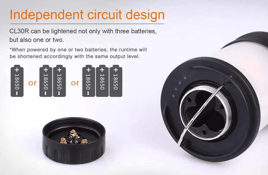 - Powered by one, two or three 18650 rechargeable Li-ion batteries