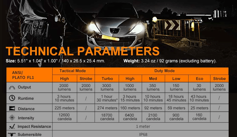Lighting Modes: Two tactical modes and 5 brightness levels in duty mode plus strobe