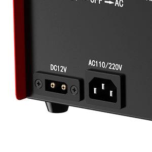 12 DC / 220 AC - There is a red rocker switch, that has three toggle positions - 12V DC (left), Null (middle), AC / mains (right)