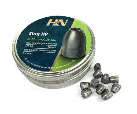 H&N recommends using the H&N 6.35 mm HP 28 grain (.250) airgun slugs in air rifles with a power of at least 40 Joules, with an optimum between 60 and 90 Joules. All slugs are visually inspected, lubed and hand packed. The exact diameter is 0.2505 inch.