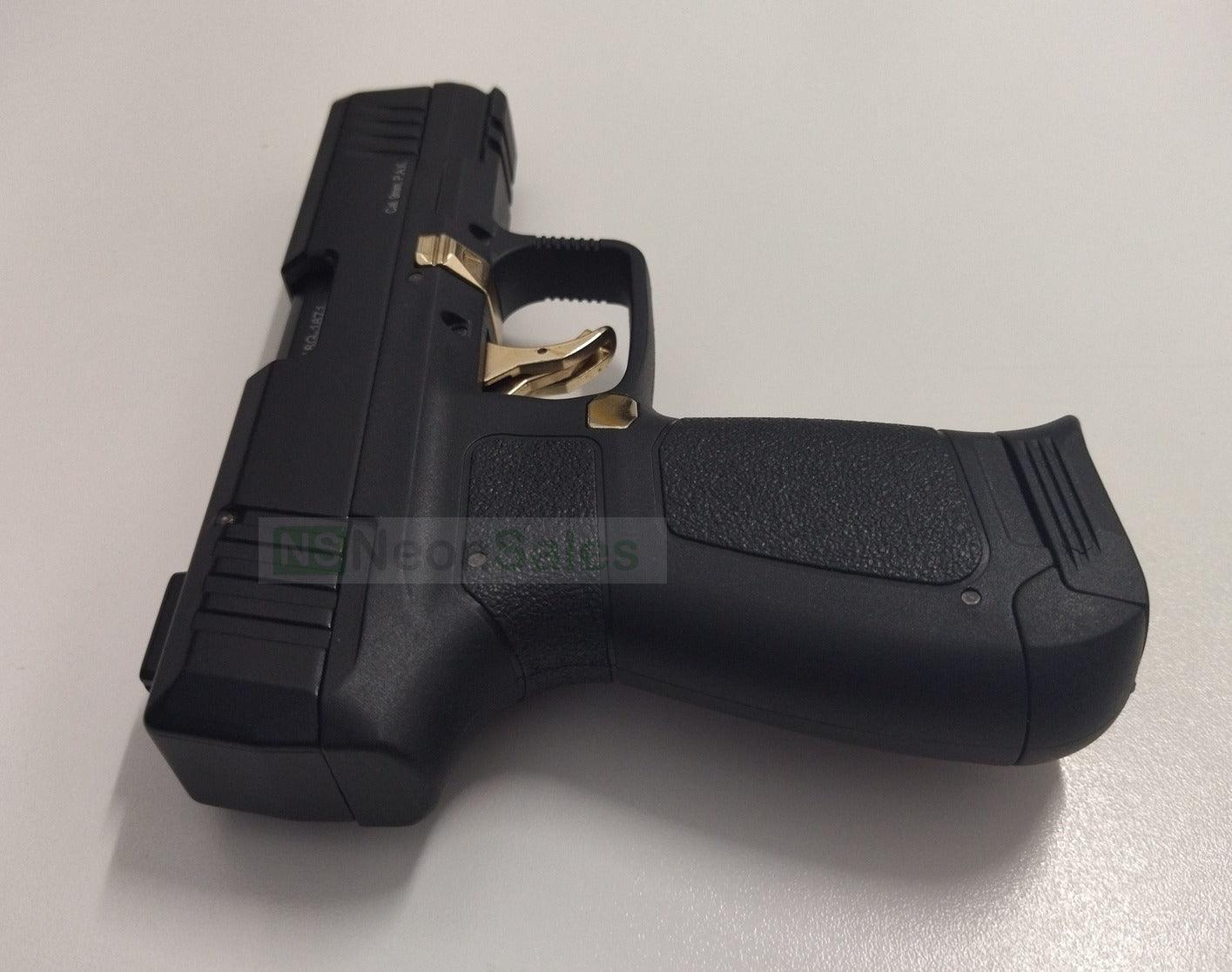 There are four cocking serration on the rear as well as the front for racking the slide, so the option to cock the gun can readily be performed either way. Unlike other KUZEY ARMS blank gun pistols, this model does feature a black ejection port, barrel and muzzle tip. The serial number is printed on the ejection port, whereas the calibre markings is printed on the lower right face of the slide.