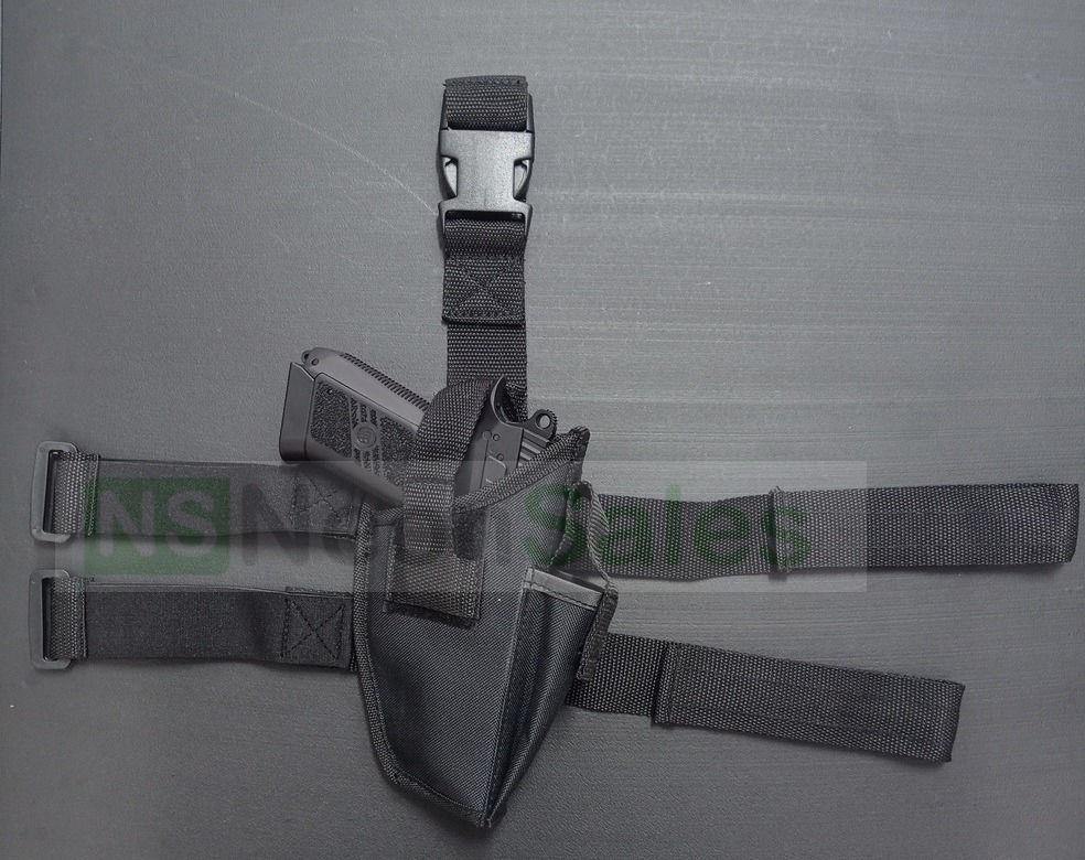 600D nylon Dropleg holster w/ stud-coupling thumb break retention. This webbing is adjustable on the offside of the holster by means of stiffly pulling it. It also has a single magazine pouch on the frontal end that retains by means of velcro sealing.
