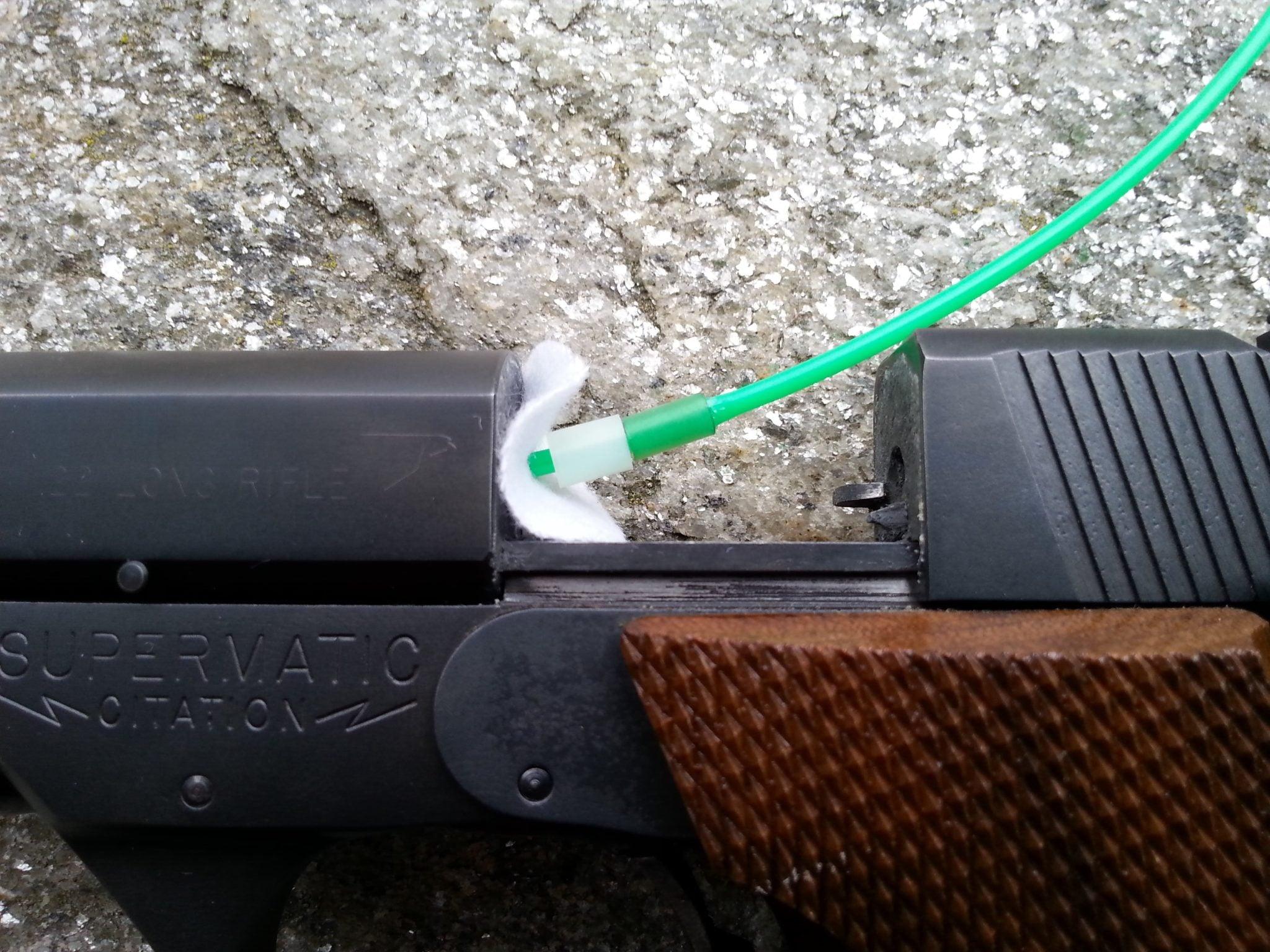 Apply a few drops of your preferred gun cleaning solvent to the patch or felt button.