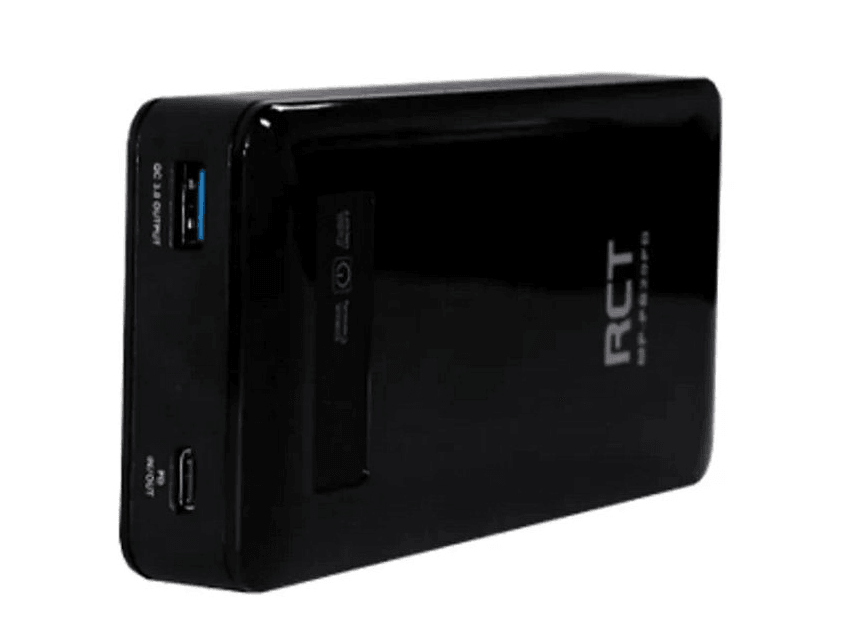 The RCT MegaPower PB20PD Lithium Power Bank - 20000mAh in black features top-quality Li-ion cells for extended battery life. It boasts a compact design that prioritizes both product safety and high efficiency, while also offering a powerful 45W charging capacity.
