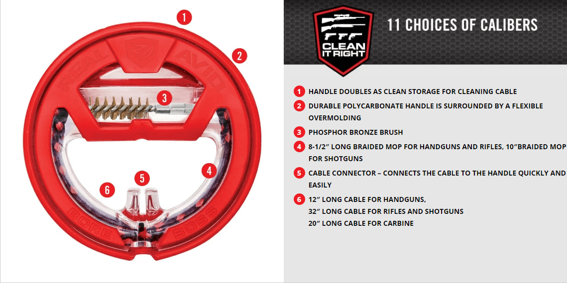 Features: - handle doubles as clean storage for cleaning cable - durable polycarbonate handle is surrounded by a flexible overmolding - phosphor bronze brush - 8-1/2″ long braided mop for handguns and rifles, 10″braided mop for shotguns - cable connector – connects the cable to the handle quickly and easily - 12″ long cable for handguns, 32″ long cable for rifles and shotguns