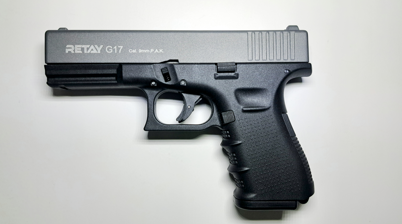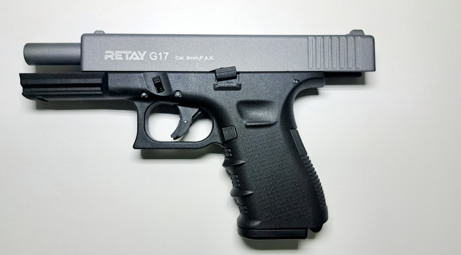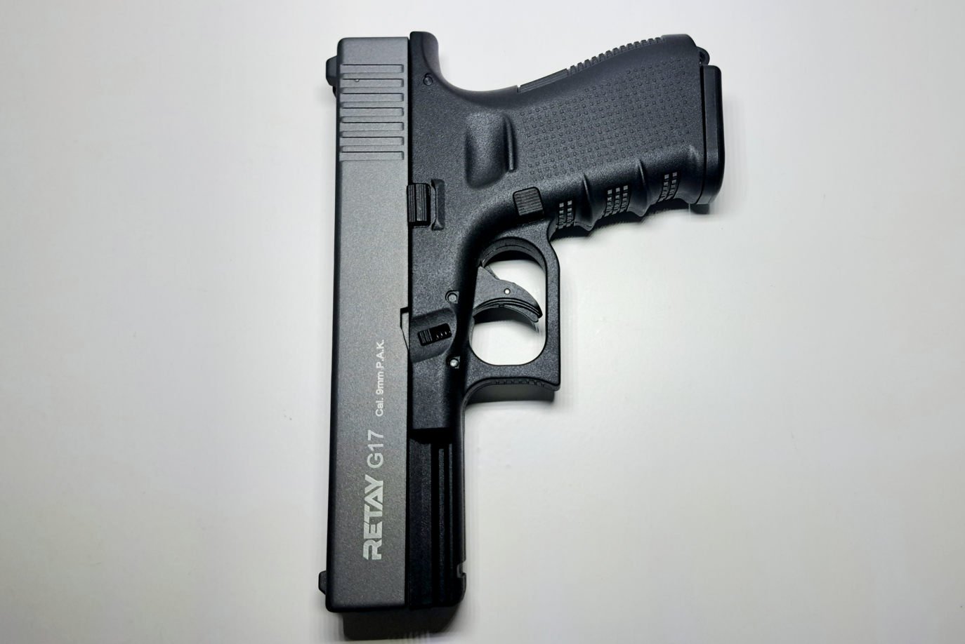 The Retay G17 Blank Gun is a high-quality, semi-automatic firearm designed to mimic the look and function of the Glock 17. This blank-firing pistol is primarily used for training, theatrical performances, self-defense practice, and as a non-lethal deterrent. Its realistic design includes a polymer frame and a metal slide, offering both durability and authenticity.
