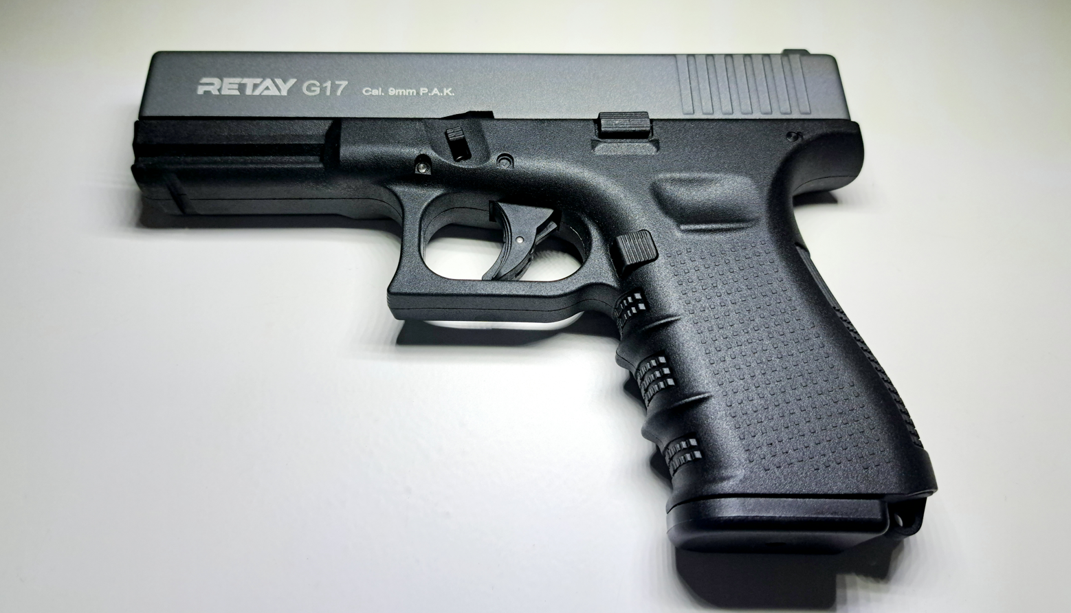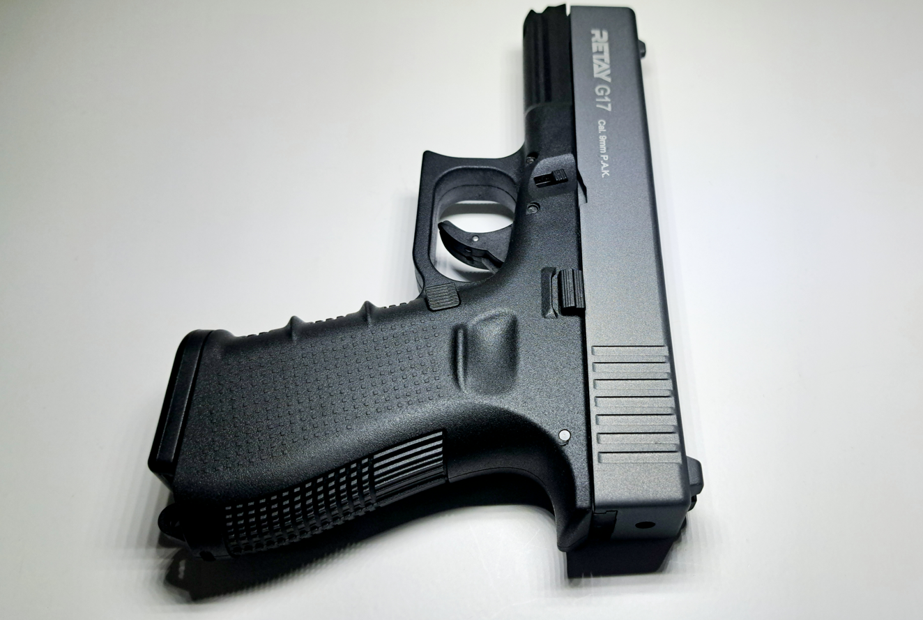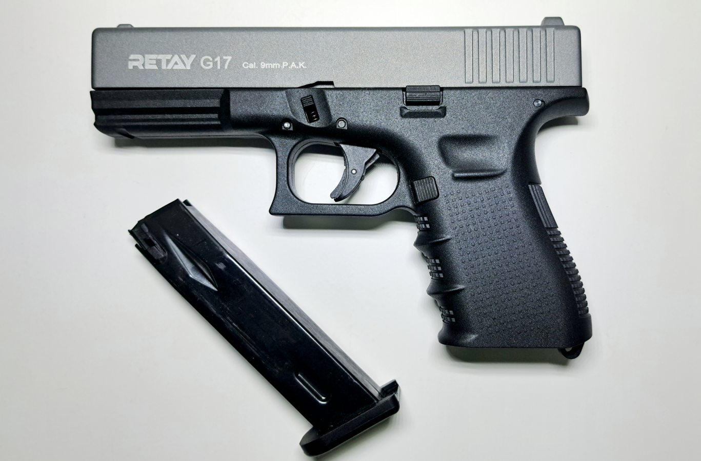 The Retay G17 Blank Gun is a high-quality, semi-automatic firearm designed to mimic the look and function of the Glock 17. This blank-firing pistol is primarily used for training, theatrical performances, self-defense practice, and as a non-lethal deterrent. Its realistic design includes a polymer frame and a metal slide, offering both durability and authenticity.