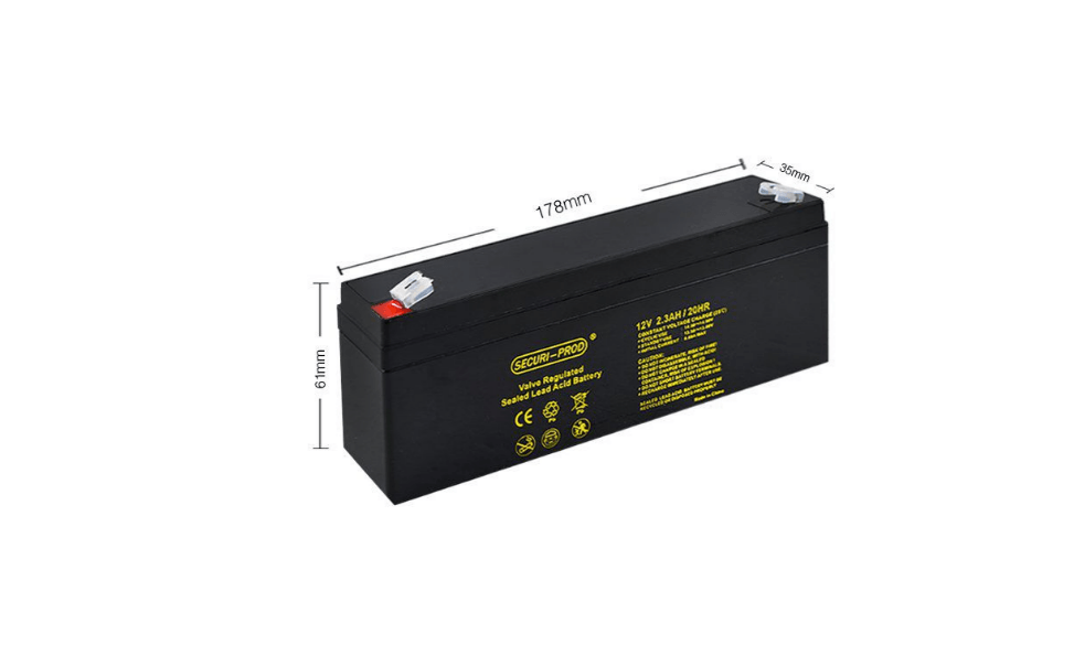SPECIFICATIONS: Brand: Securi-Prod Technology: Sealed lead acid battery Nominal Voltage: 12V Capacity: 2.3AH Terminals: T1 Battery dimensions: 178mm(l) x 35mm(w) x 61mm(h) Battery dimensionsincl. terminals: 178mm(l) x 35mm(w) x 67mm(h) Battery weight900g