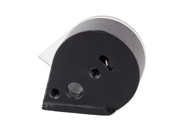 Manufactured from aluminium, black dyed w/ torsion spring insert. The frontal transparent vinyl cover shows the pellet count whilst also serving as the wind-up dial that, when rotated completely against the tension of the spring, allows for the first pellet to be inserted (which must be inserted skirt first, head up). This locks the rotating core in place, allowing one to drop-in the consecutive pellets, filling up the entire magazine.