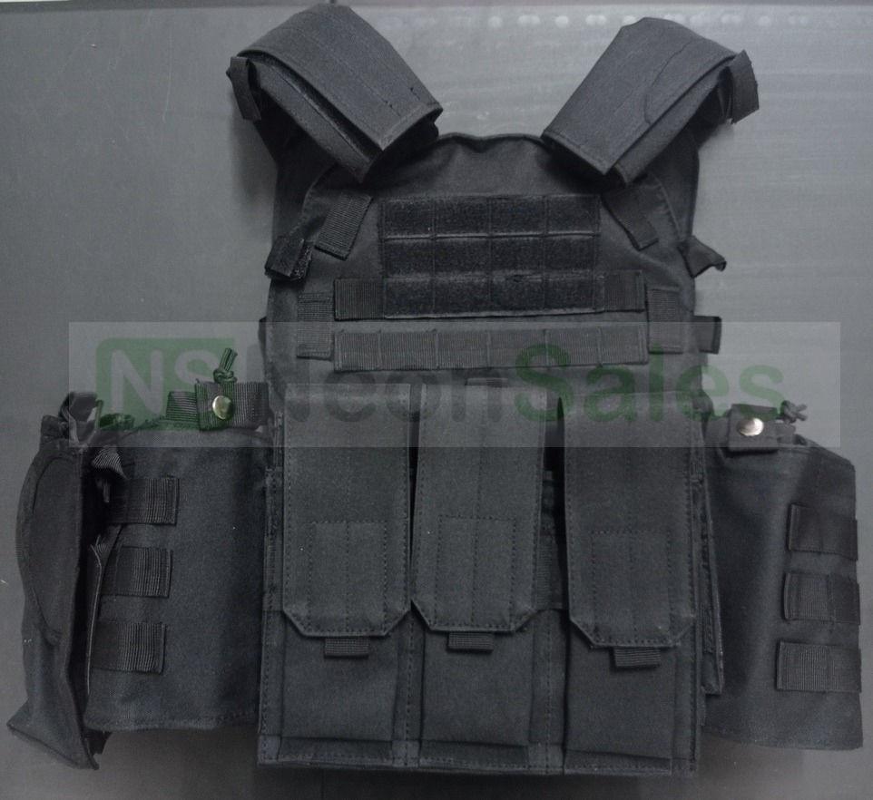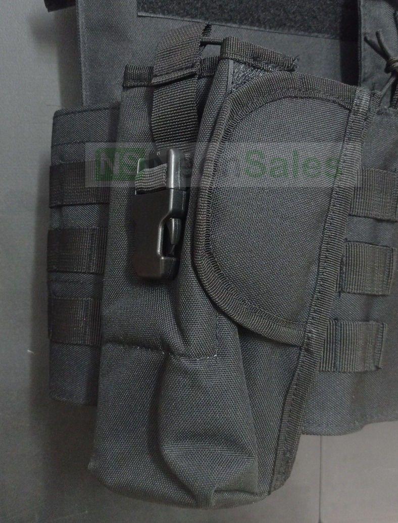 Beneath this, there is a removable triple magazine pouch MOLLE attached on this vest. These pouches have flaps that peel open by means of webbing tongues. Behind this triple magazine pouch, is a velcro-sealable document pouch w/ a central webbing tab for splitting the velcro open. This pouch would be the second top layer and is attached to the bottom-most layer. This layer can be lifted up. to expose the vest sides which is clammed there between the bottom-most layer and the second layer. The two arm ends are attached to one another per bungee chord, looped through opposing metal eyelets. There are two such bungee chord pairs for binding the arms. This adds extra support, since side plates are an option on this vest.