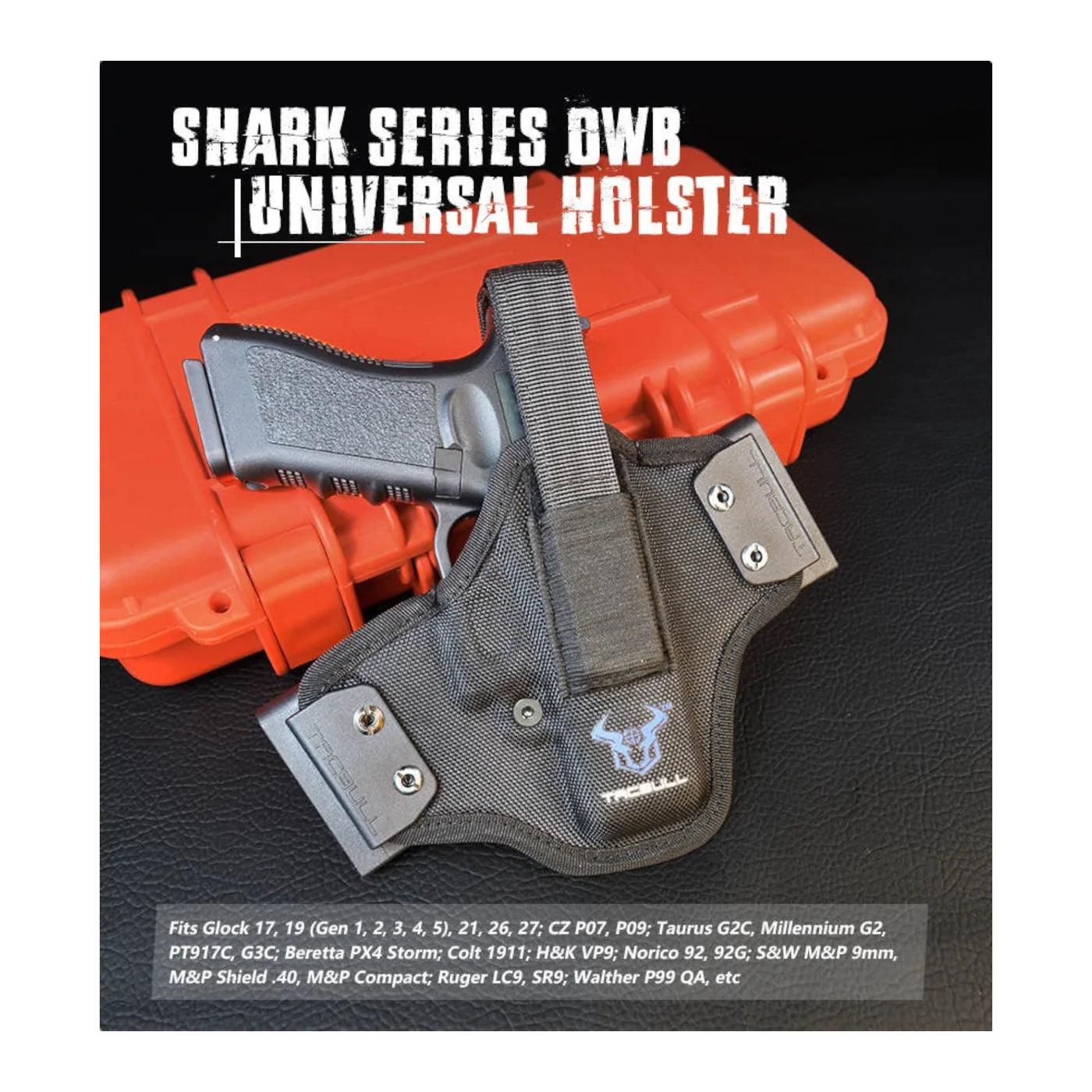 The Tacbull Shark Series OWB Universal Holster is designed to accommodate a variety of handguns. Here are some key features: