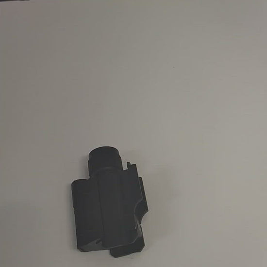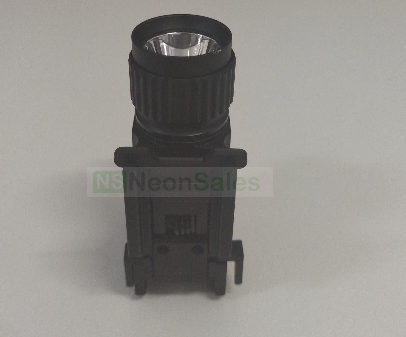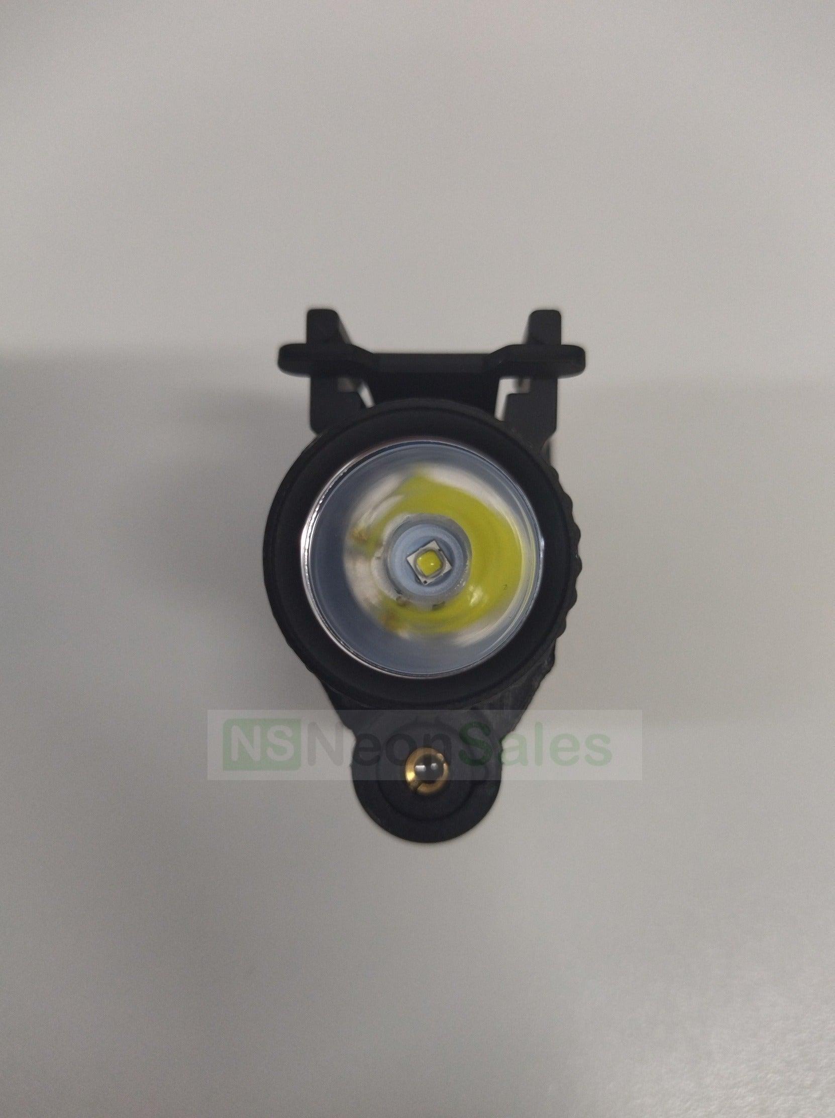 Offers nice versatility in that, you have a 300 LM LED flashlight w/ 18mm bezel which for indoor use, is quite bright and does illuminate quite a ways, in terms of distance (useful up to 15 meters, yet also creates a wide angle of illumination). This flashlight as shown, activates simply by pushing the aluminium tab through from left to right. It is serrated btw, for added traction. Pushing that same tab through from the otherside, of course, deactivates the flashlight. Switching the lamp on again, will activate the strobelight, which generates a disorientating effect on whose eyes / sight that flickering light falls onto.