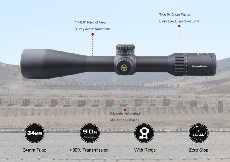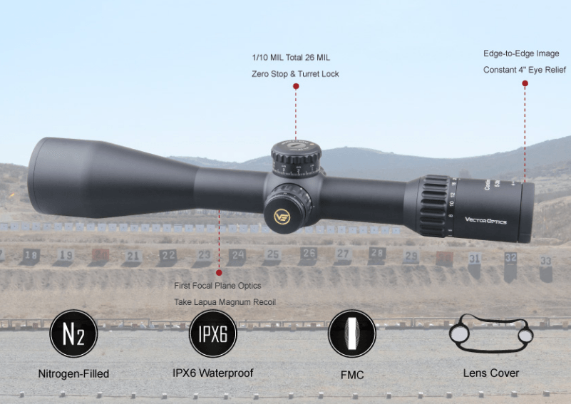 Immerse yourself in the premium line by Vector Optics, a product that surpasses some of the most famous optic brands worldwide. With a 34mm monotube made of 6061 T6, this first focal plane scope features German Schott HD Glass and a LaREE lens with VePRO FMC for over 90% light transmission.